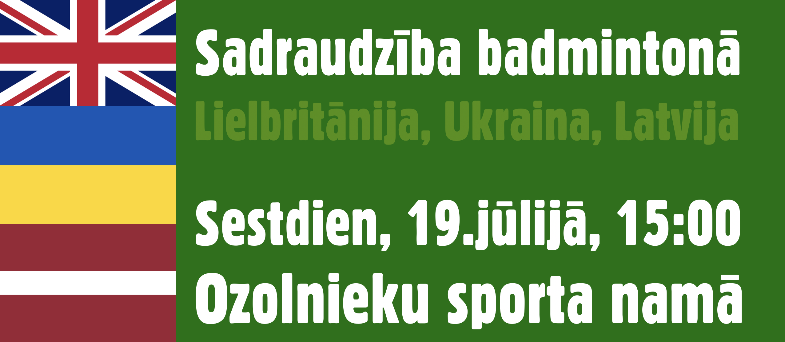 Ļoti neparasts badmintona pasākums notiks Ozolnieku sporta centrā, sestdien, 19.jūlijā, no plkst. 15:00 līdz 17:30. Draudzīgā un saviesīgā atmosfērā badmintonu spēlēs jaunieši no Lielbritānijas un Ukrainas. Aicinām pieteikties arī Latvijas spēlētājus un līdzjutējus!